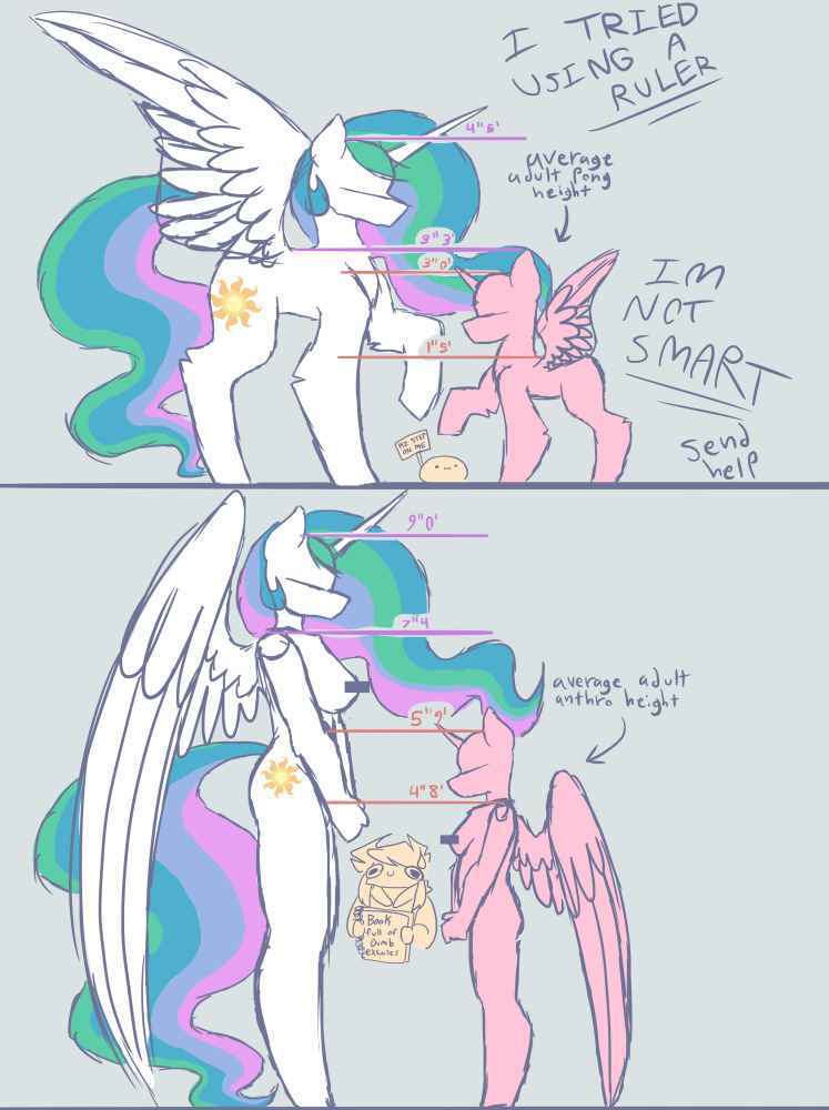 Обычный пони, среднестатистического размера, смотрел бы Селестии чуть ниже груди, если бы они стояли прямо перед друг другом. Более высокие земные пони, могли бы удостоиться чести лицезреть её грудь, а Спайк же мог с гордостью утыкаться в её живот, если не ниже.