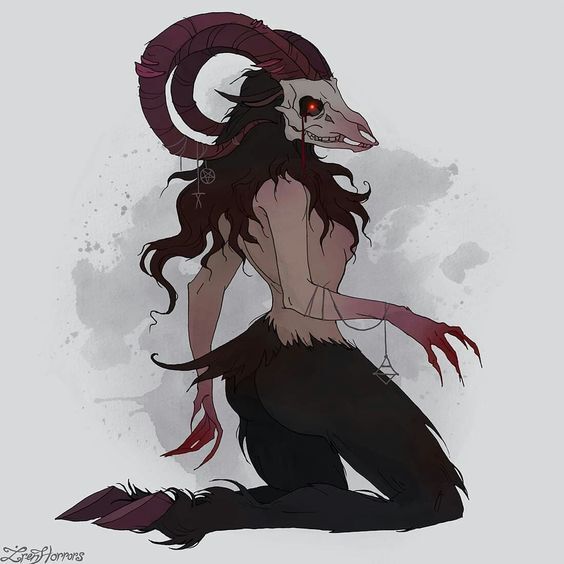 Грешница, полуголая сатир, что имела козьей низ и человеческий верх… Если не смотреть на скелет какого-то животного, с вытянутой мордой, длинными, завёрнутыми в обратно от морды рога и… красными глазами или искрами, что источали неприятное свечение. Длинная шевелюра, что и кое-как прикрывала неплохую грудь, пока острые кровавые когти, вместо ладоней взяли саму брошюрку.