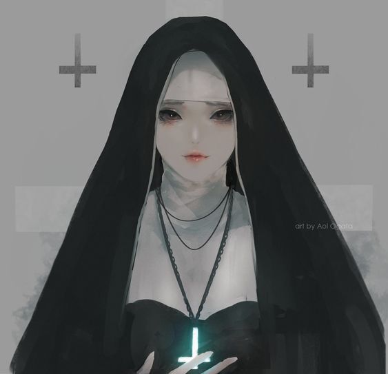 Его нынешний "образ". Длинные платиновые волосы, собранные в хвост, ряса священника с крестом на груди. Чуть изменённое лицо его… прежнего, ангельского, облика. Фиолетовые глаза. Вот и весь образ.