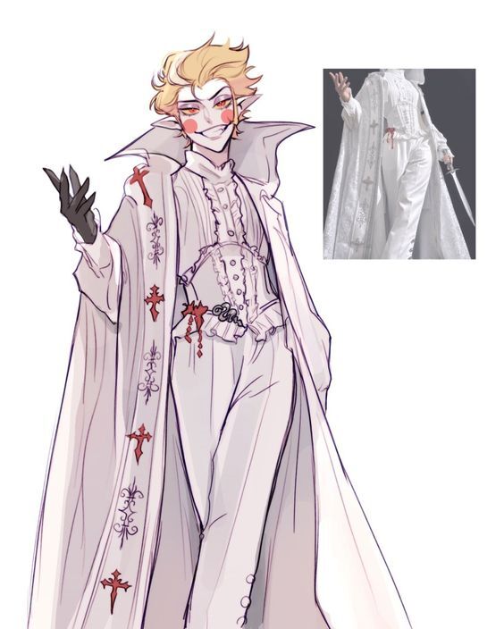 Белые брюки, чёрные туфли, белый корсет на белой жилетке. Снова длинный воротник мантии.