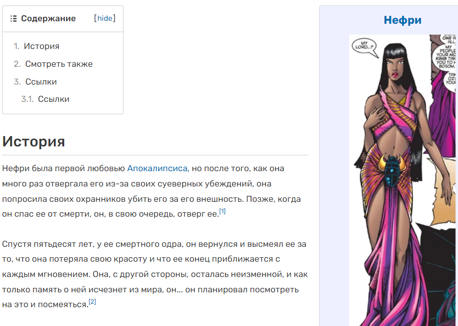 (Нефри, первая влюблённость Апокалипсиса, ну и информация по ней с вики для ленивых… и да, с учётом, что это персонаж с комикса 1996 года, авторы реально старались нарисовать её красивой, так что Апоки понять можно)