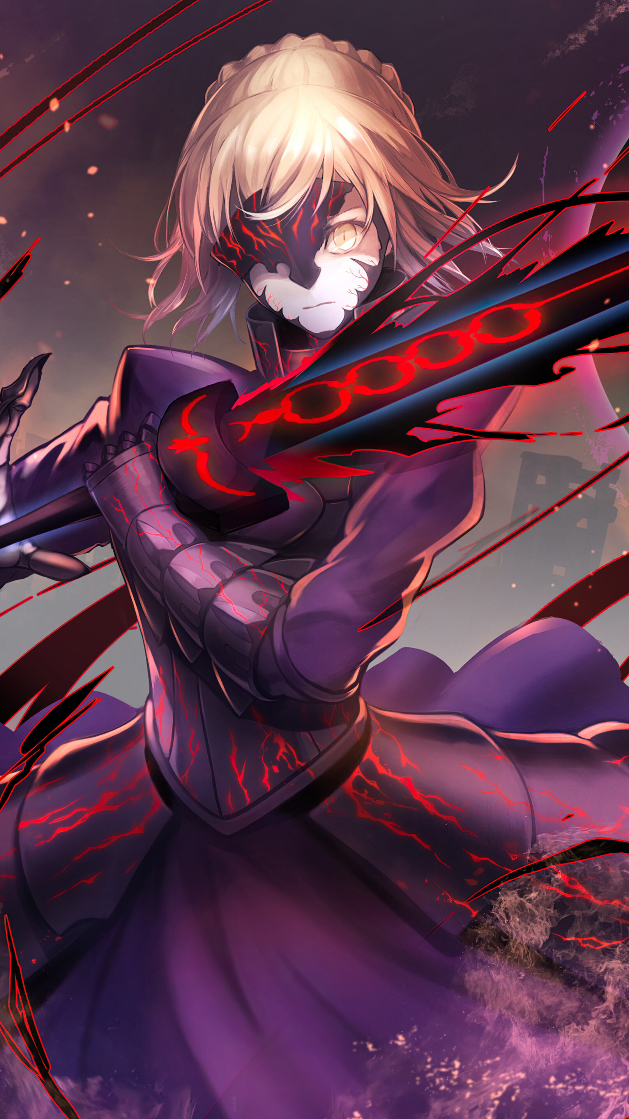 Слуга класса Сэйбер Артурия Пендрагон была откровенно миниатюрной красавицей даже в черных шипастых доспехах, покрывавших большую часть ее тела. Ее светлые волосы, щедро одаренные поцелуями солнца, теперь были ближе к серебристому оттенку луны, но все еще отчаянно держались за свой золотистый отблеск. Но больше всего Артурия выделялась своими призрачными золотыми глазами, которые сияли подобно звездам на ее бледном лице, особенно выделяясь на фиолетовом свете, исходящем от испорченного Грааля позади нее.