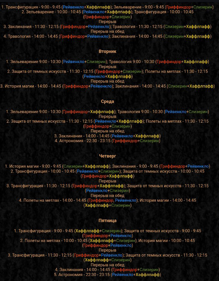 Прочитав расписание пару раз, я «поставил» данную информацию на отдельную полку с пометкой «часто используемые» в своём разуме… всё по наставлению Нарциссы, в