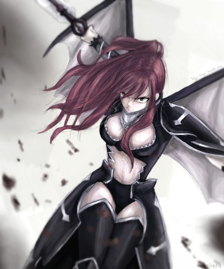 Волшебница оказалась писанной красавицей с длинными алыми волосами и ярко карими глазами. Сама девушка обладала роскошной фигурой. Можно даже сказать потрясающей! С первого взгляда было видно, что эта она серьёзно относится к спорту и собственному здоровью. И причудливый доспех с плащом, что мог трансформироваться в крылья летучей, хорошо подчёркивал все достоинства молодой волшебницы. Причудливым он являлся из-за того, что броня присутствовала только на ногах, руках и спине. Живот, грудь и область паха были полностью открыты. Благодаря такому выбору брони все присутствующие увидели фиолетовые трусы девушки. К счастью, пышную грудь скрывал аналог брони-лифчика.