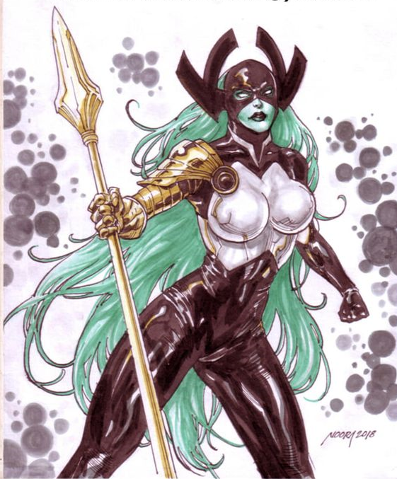 Гамора указывает пальцем вперед, и среди толп пересекающих небольшую улицу людей, я замечаю тёмный силуэт женщины, с длинными, подобно стекающему ручью, длинными волосами, отдающими бирюзой. Они скользят по воздуху и растворяются. В её руках блестит острое копье.
