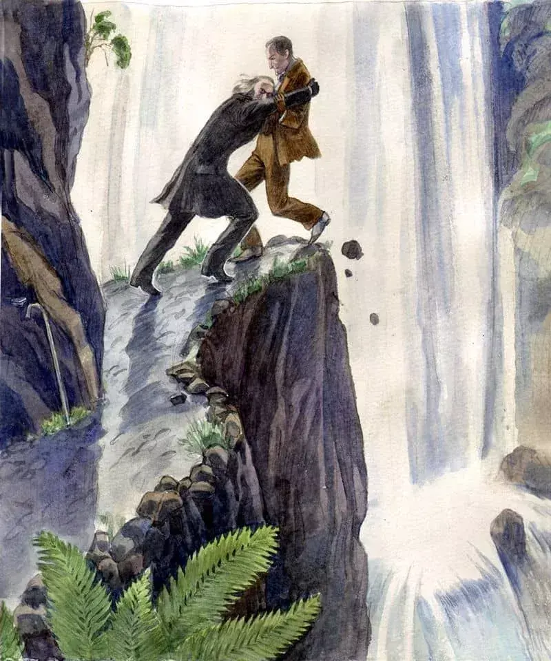 Пользуясь преимуществом в физической силе и уверенностью в своих вампирских возможностях, Мориарти вёл себя весьма бесстрашно. И столкнув таки Холмса, недооценил того, и не заметил как человек успел ухватиться за его одежду, и пользуясь весом собственного падающего тела, буквально сдёрнул вампира за собой.