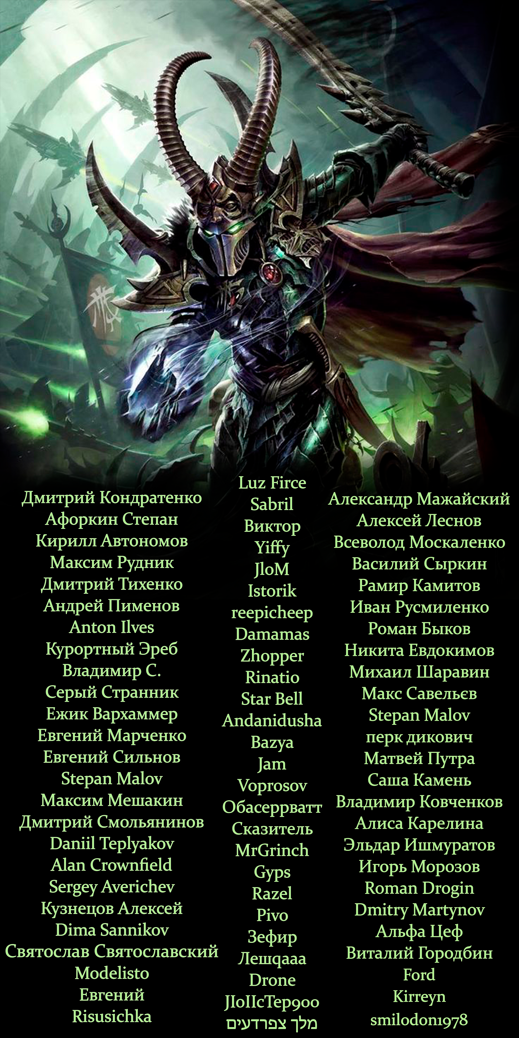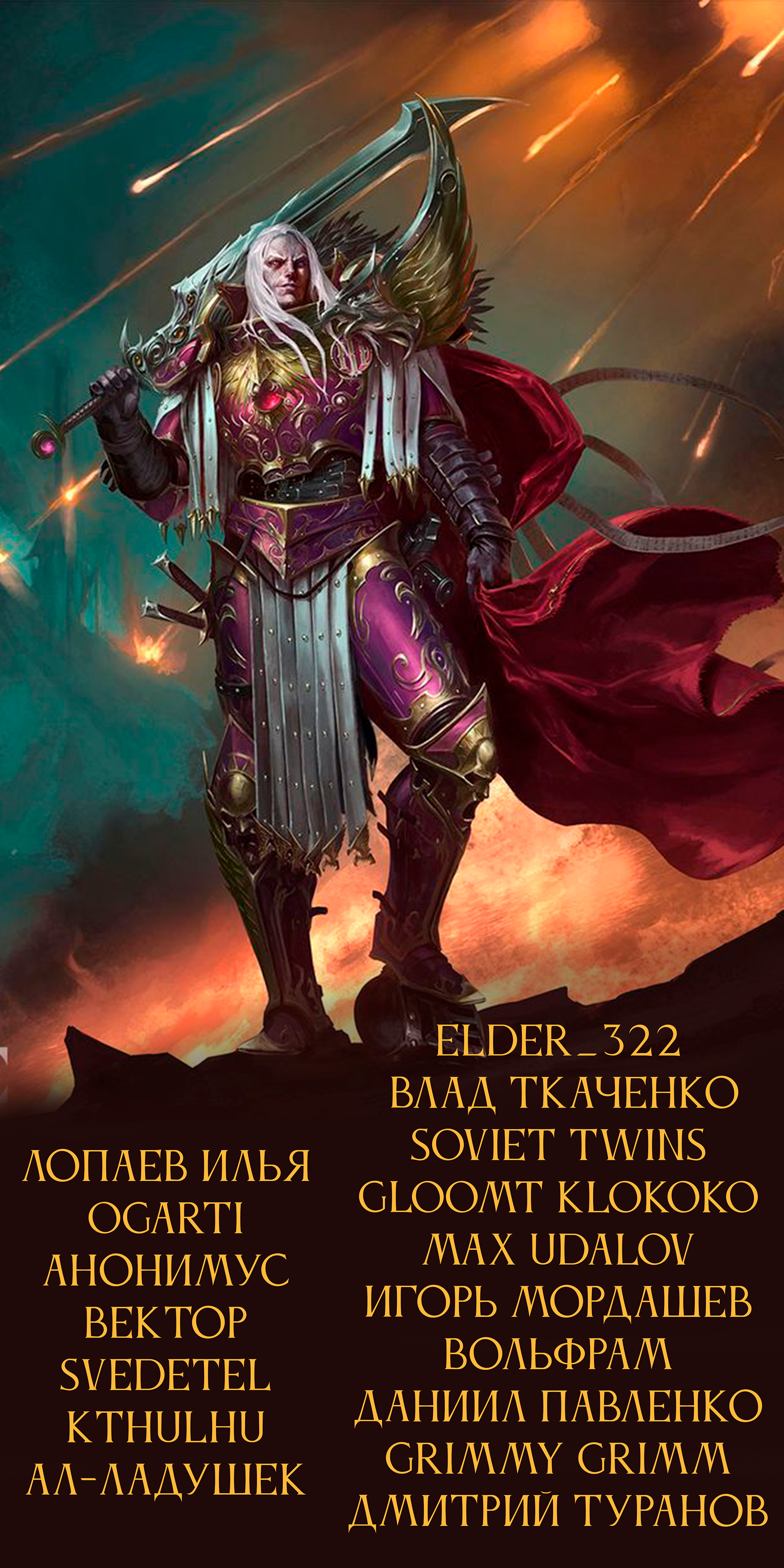В любом случае спасибо, что вы есть. И конечно же благодарности с артиками, которые в конце шестого тома. Там надменный Фулгрим, друкхари-садист и сиськи.