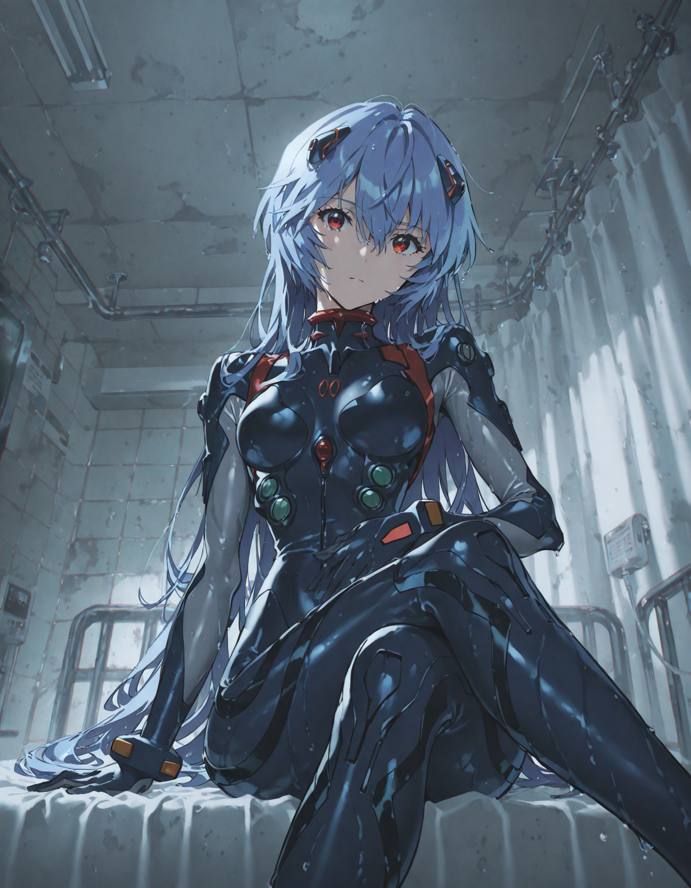 Комбинезон чёрного цвета с белыми и бордовыми вставками, поблёскивающий от влаги на нём, почти не оставлял простора для воображения, плотно облегая фигуру Аянами. Также, в густой копне ещё мокрых волос успел заметить две небольших… заколки?