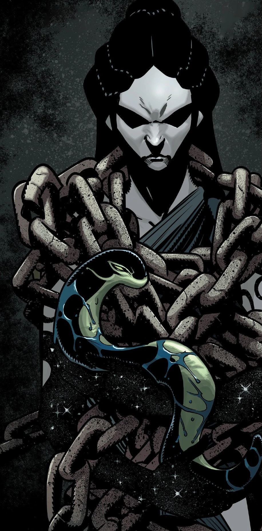 (Ойзис родилась уже в темнице, именно потому и не скована цепями и не упомянута в "пояснительной табличке", собственно это её облик змеи)