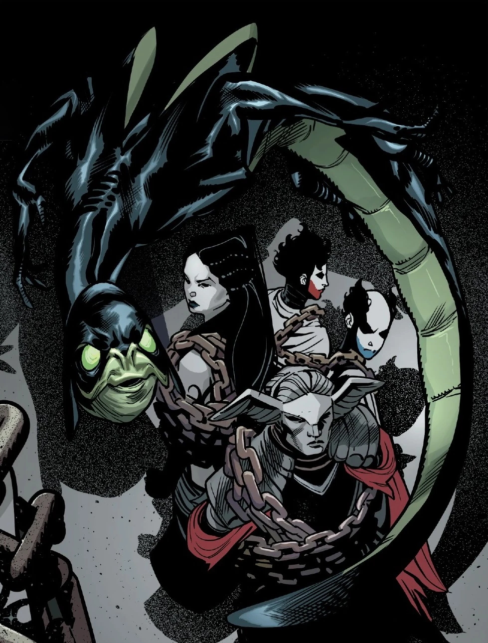 (Никс с детишками в заточении… цепи и правда на них намотали от души, вокруг же летает Ойзис в полугуманоидной форме)
