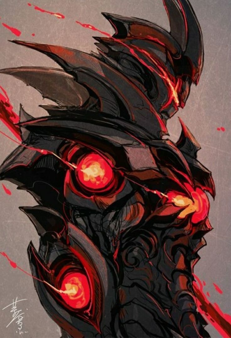 Однако, были там и иные элементы, кроме черного металла, а именно пять багрово-красных шаров неизвестного назначения, по два в плечах и предплечьях, а также один, самый большой, в груди. Ну и, наконец, сам шлем имел алую полосу, этакий визор, на уровне глаз благодаря которой владелец брони мог видеть окружающее пространство.