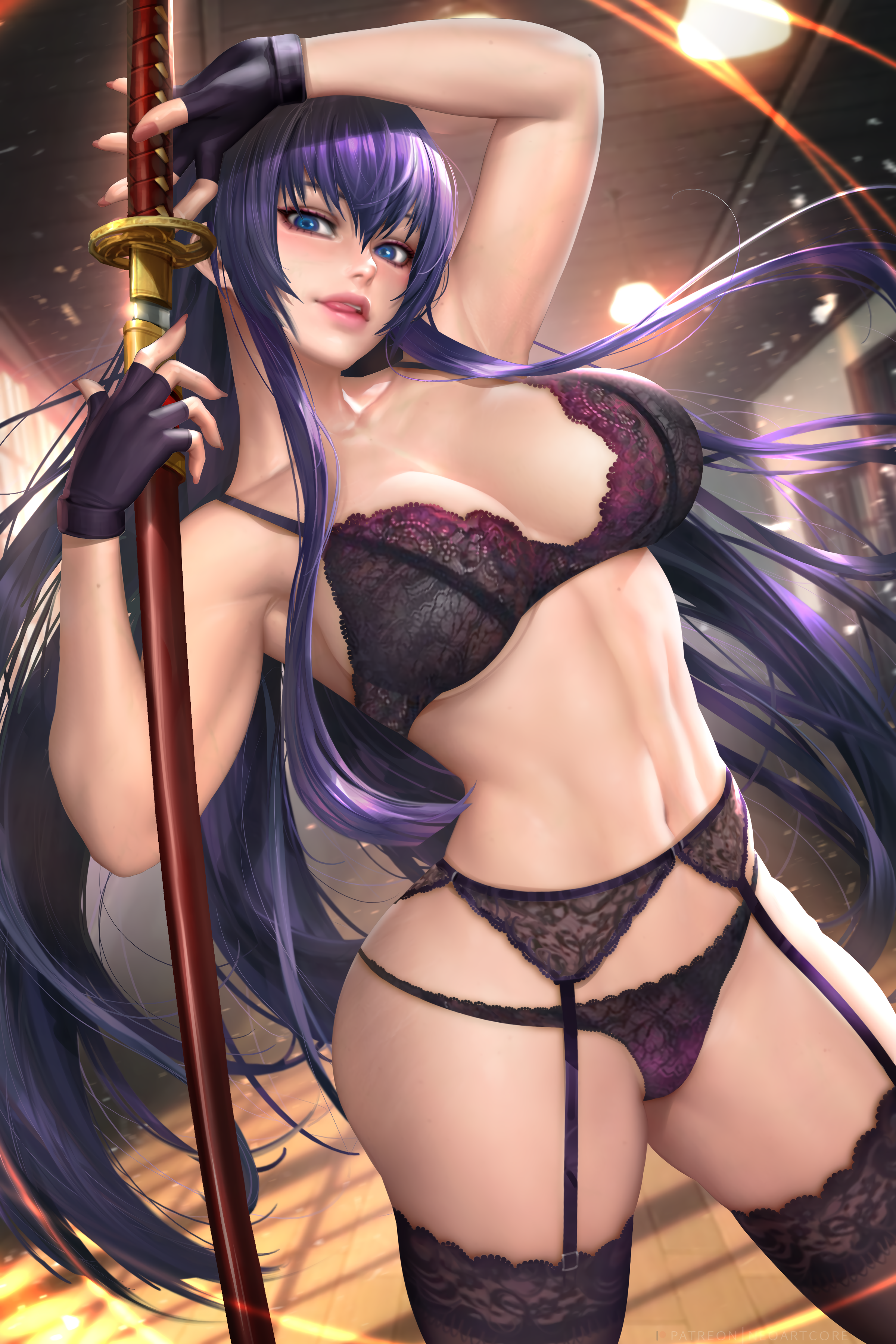Прежде, чем приступить к делу, девушка быстро сняла с себя футболку с юбкой, оставшись в одном лишь фиолетовом нижнем белье и чулках. Сделав пару шагов в сторону, она подняла свою катану и уже с ней подошла ко мне.