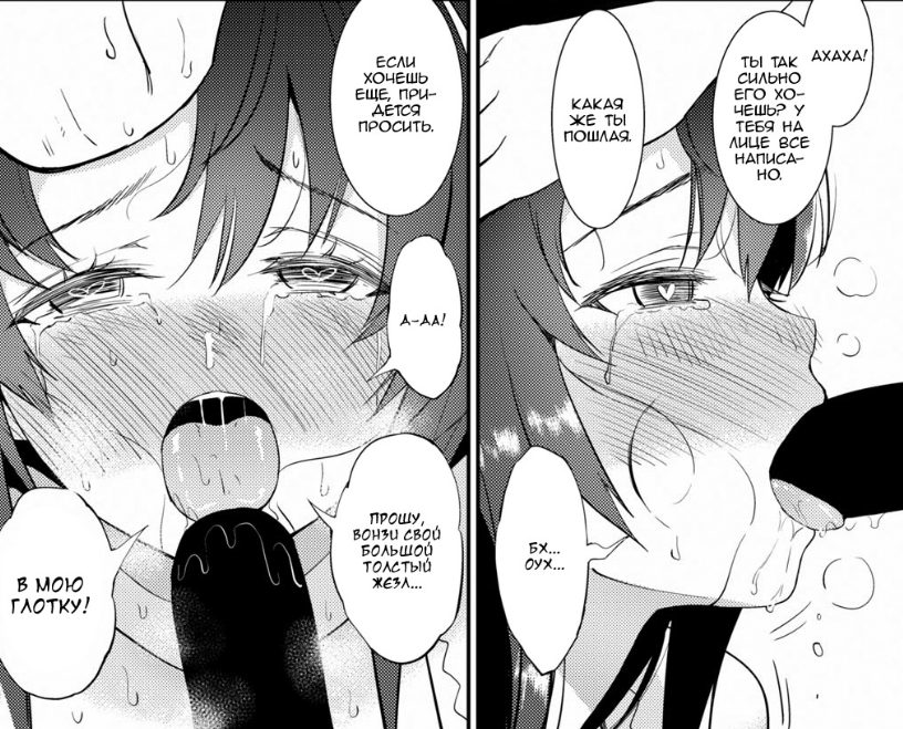 — Д-да! Прошу, вонзи свой большой толстый жезл в мою глотку…в мою глотку! — умоляюще воскликнула Саюки со слезами на глазах. Похоть полностью поглотила её, затуманив разум.