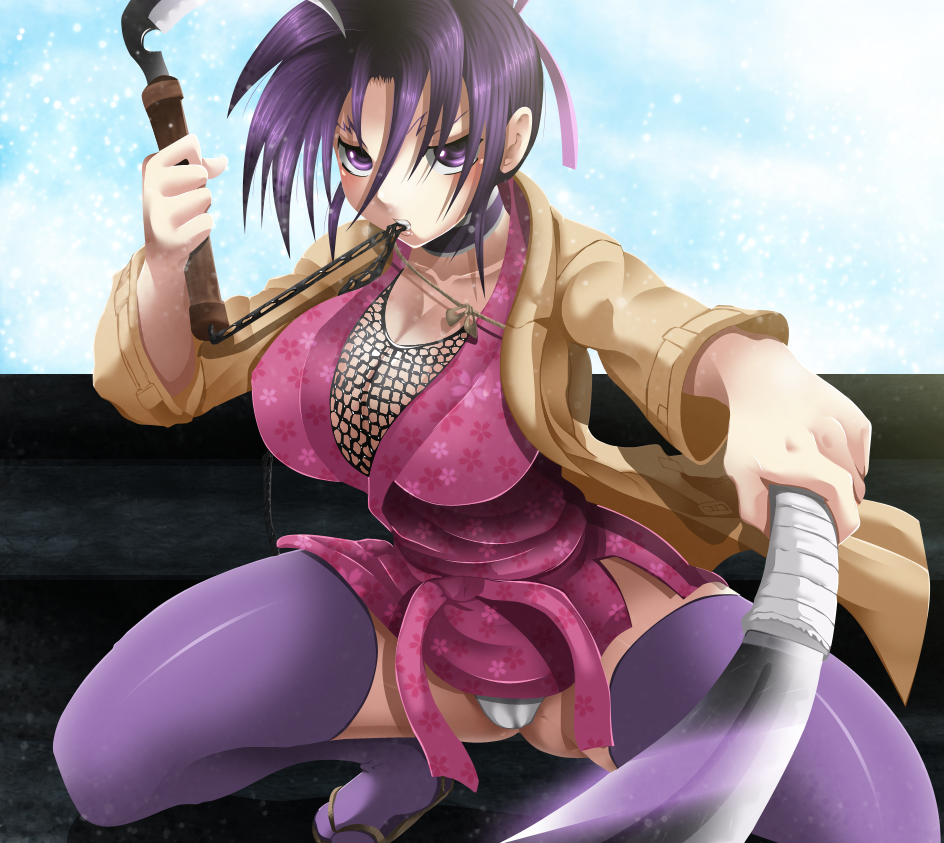 На крыше дома притаилась небывалой красоты девушка. В одной её руке был длинный меч, а в другой кусаригама, цепь которой девушка держала в зубах. На незнакомке было надето короткое розовое кимоно, едва справлявшееся сокрытием её удивительно объёмного бюста. Да и с прикрытием нижней части оно справлялось из рук вон плохо, открывая вид на край нижнего белья. Спортивные ножки незнакомки были обтянуты длинными фиолетовыми чулками. Учитывая одно только это, девушку можно было счесть богиней. Но по-настоящему меня заворожили её зигзагообразные, похожие на молнии, брови и бездонные фиолетовые глаза, от которых я просто не мог отвести взгляд.