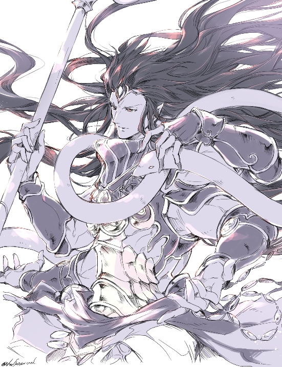 Первым к нам пожаловал здоровенный трёхметровый мужик в доспехах, четырьмя руками и внушительных размеров белой змеей на собственной шее, да гигантским посохом в руках.