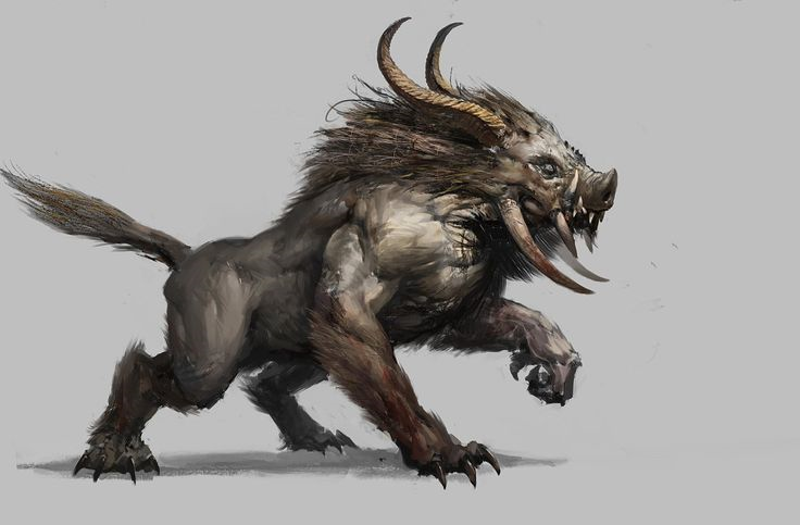 Сквозь короткую серую шерсть можно было увидеть перекатывающиеся жгуты мощнейших мышц, что свободно двигали огромную махину, словно та весила не тонны, а пару десятков килограмм. Сильные ноги вонзались в землю острейшими когтями постепенно лишь набирая скорость. Кабанья морда была украшена серой гривой, двумя острыми рогами торчащими из черепа‚ четырьмя бивнями, что росли из скул и торчащими из пасти клыками.