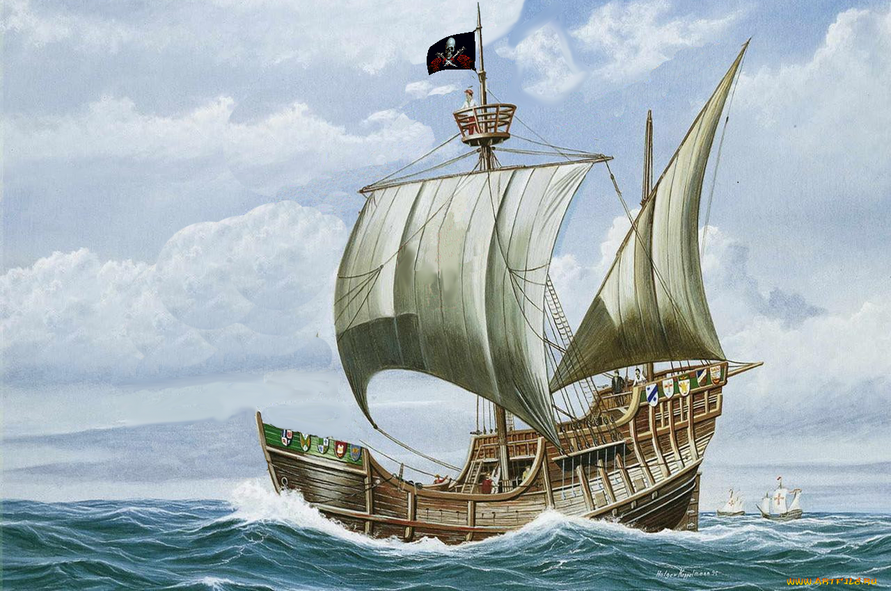 Небольшая тридцати метровая каравелла, с двумя мачтами, одна по центру с квадратным парусом, вторая на корме с треугольным парусом. Когда-то паруса были ярко белыми, но время оставило на них свой след, от чего они посерели. Верхняя палуба имела три уровня: самый высокий занимал кормовую четверть корабля, средний уровень был на два метра ниже и занимал вторую четверть с кормы, и нижний уровень занимал оставшуюся половину корабля, на четыре метра ниже верхнего.