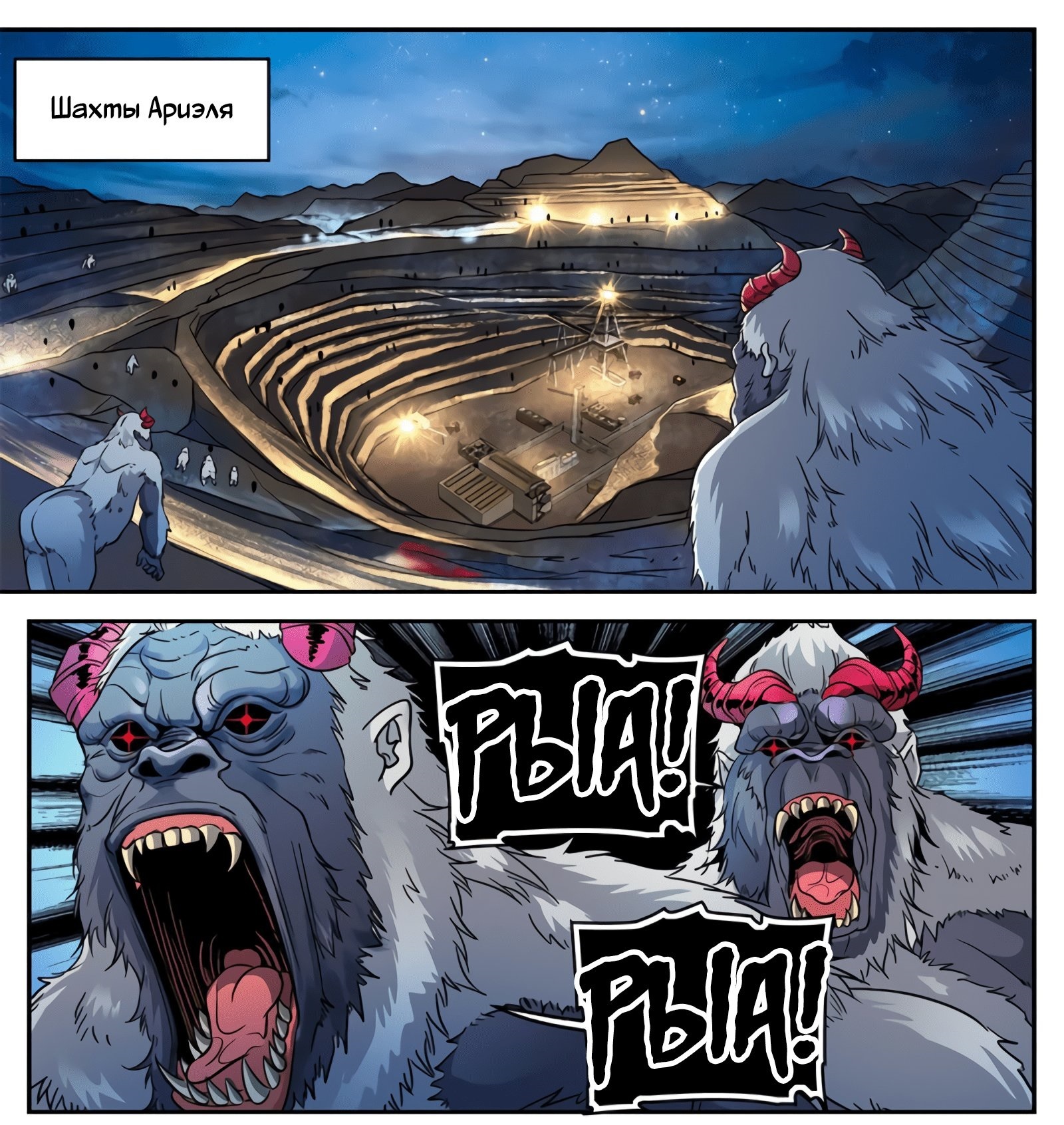 Рудник находился у подножия великих Анд, был окружен горами с трех сторон, и представлял собой огромную воронку в земле километр шириной и половину километра глубиной, на дне которой располагались парочка административных зданий, и единственный вход в шахту, что уходила под горы. И все пространство рудника теперь занимали магические обезьяны. Размером с самых обычных горилл, их тела были покрыты белой шерстью, на голове красовались красные рога, а в глазницах горели красные глаза.