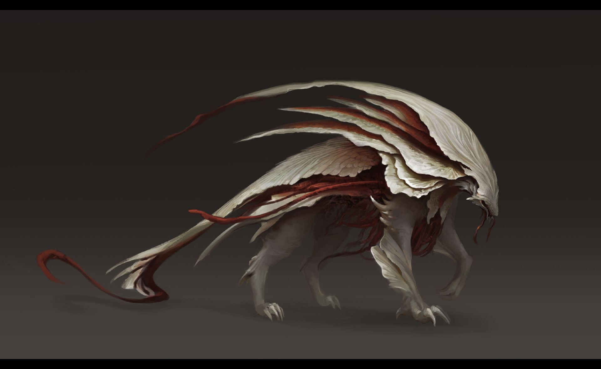 Двухметровая махина белого цвета, стоящая на четырех звериных лапах с острыми когтями, тело зверя было словно укрыто шестью белыми листьями огромных деревьев, что несколькими слоями укрывали все тело сверху‚ начиная с головы и до кончика гибкого красного хвоста. Но самое невероятное находилось на нижней части тела: вызывающее невероятное омерзение щупальца красного цвета, что ежесекундно извивались ощупывая округу.
