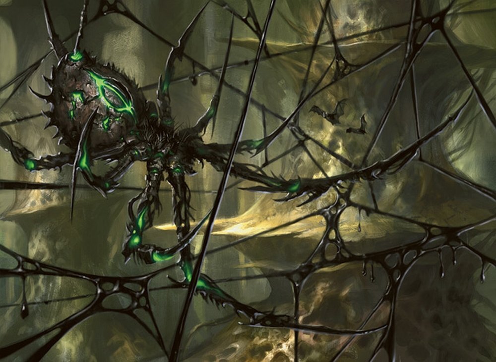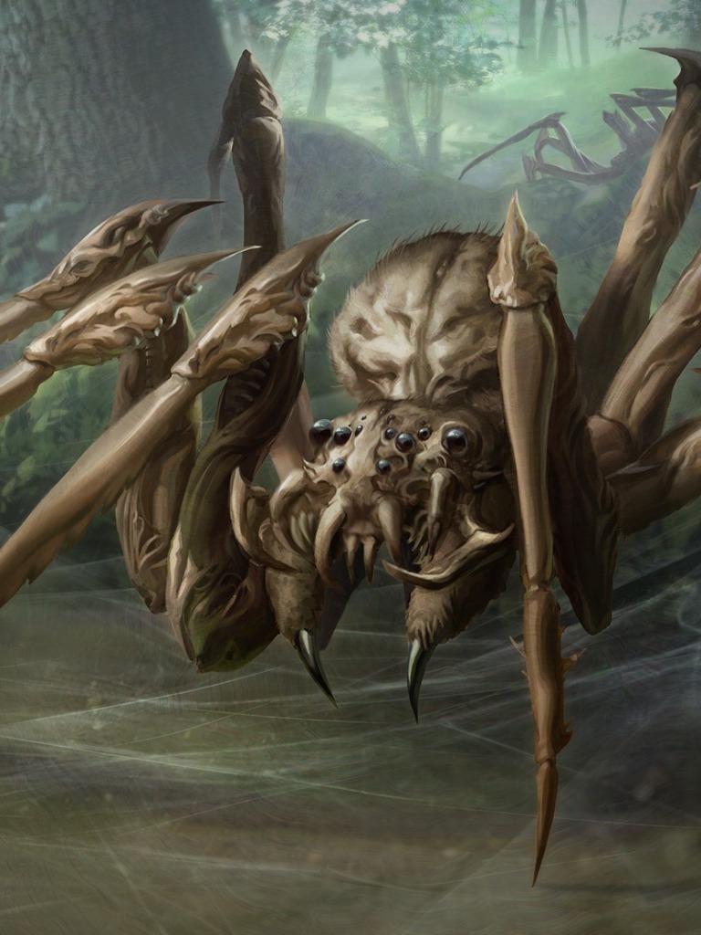 На деревьях, впившись в кору ствола находились небольшие пауки. Тело без ног было около метра длинной, сами сегментные конечности добавляли еще метр охвата, но самым выделяющимся были кислотно-зеленые прожилки, что виднелись сквозь хитин по всему телу паука‚ особенно ярко светился зеленым крест на внутренней стороне брюшка. Глаз у пауков видно не было, но они смогли заметить появление в сорока метрах от них магов.