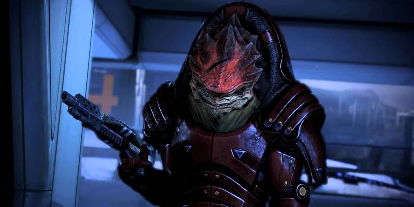 Первым не человеком оказался Рекс — крупный двухметровый кроган в тяжёлой броне и с дробовиком. Тут бы мне и до его внешнего вида прицепиться, но я вообще не помню за все три части масс эффект, чтобы хоть один кроган разгуливал без брони. Поймал себя на мысли, что понятия не имею, как они без неё выглядят.