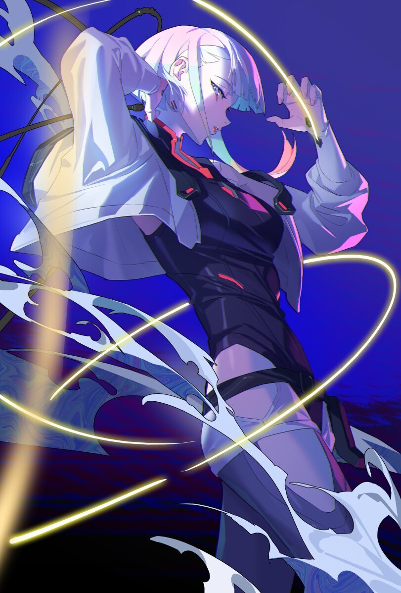 Дабы не светить лицом на людях, я накинул на себя капюшон, но кое-кто меня всё-таки заметил, точнее, на выходе из палаты в мою грудь случайно врезались. Это была молодая девушка азиатской внешности со светло-фиолетовыми глазами и белыми волосами, подстриженными раздельным бобом — левая сторона оставлена длиннее — и окрашенными в белый радужный градиент с отливом. Стиль её одежды — китч, смешанный с неомилитаризмом: она носит укороченную белую куртку с чёрным комбинезоном нетраннера с красными вставками поверх пары белых шорт и высоких серых чулок, а также чёрные сапоги до колен.