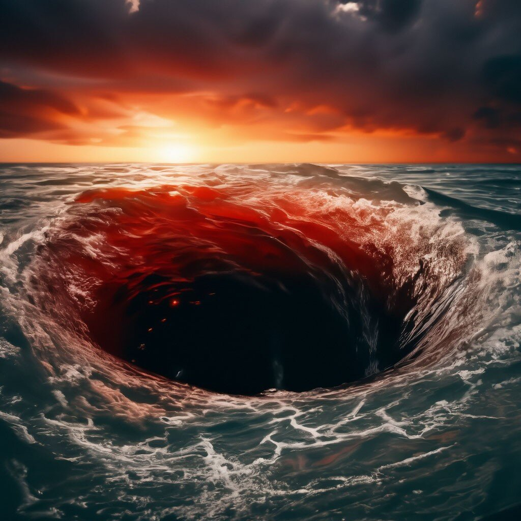 Сейчас же от него остались лишь две раскуроченные и горящие половины, между которыми крутилась огромная воронка водоворота, чем-то напоминающая картины к рассказу Эдгара Аллана По — Низвержение в Мальстрём.