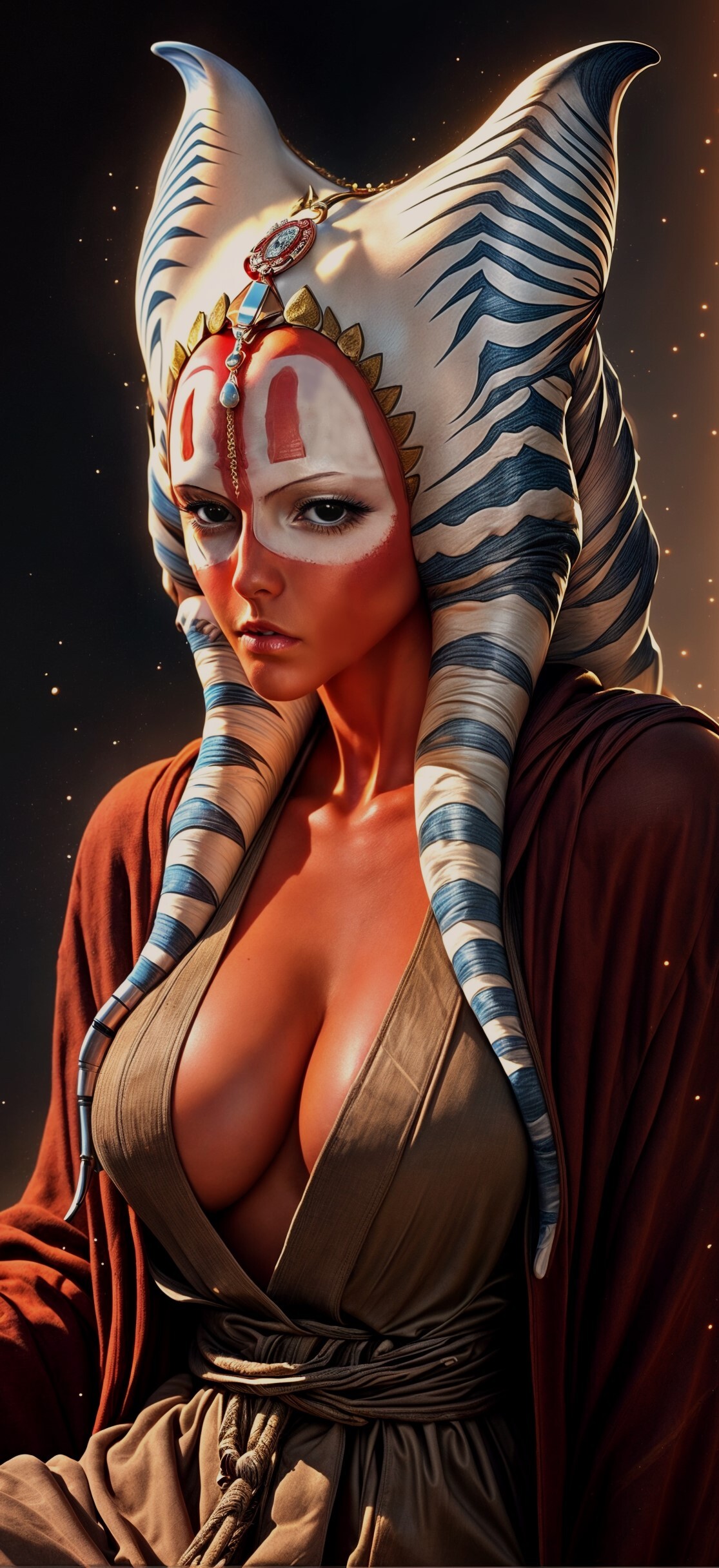 1. В нашей истории тогруты — долгожители, живущие от 300 до 500 лет, хотя встречаются и прожившие дольше, пусть их и не так много. Тогруты обладают яркой, полосатой окраской, напоминающей камуфляж. Их кожа варьируется от оранжево-красных до пурпурных и синих оттенков, а белые узоры на лице и теле уникальны для каждой особи, подобно отпечаткам пальцев у людей. Голову украшают монтралы — полые рога, используемые для эхолокации, и малоподвижные лекку — мясистые отростки, схожие с твил’лекскими. С возрастом монтралы изгибаются, а третий лекку вырастает до уровня основных. У них острые клыки, унаследованные от хищных предков, которые позволяют быстро убивать добычу. Зрение тогрут превосходит человеческое, особенно в темноте, а эхолокация помогает ориентироваться в густых лесах Шили. При физических нагрузках полосы на монтралах ярчают, подобно румянцу у людей.