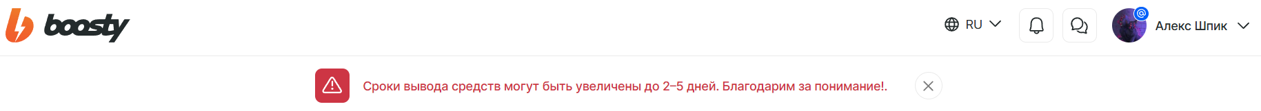 Что же касается ситуации с бусти, я всё ещё в выжидательной позиции, ибо вроде те и извинились, и деньги вернули обратно на баланс бусти, но те всё ещё не выводятся и висит вот эта плашка (появившаяся буквально через полчаса после ответа мне администрации, оперативно, да…)