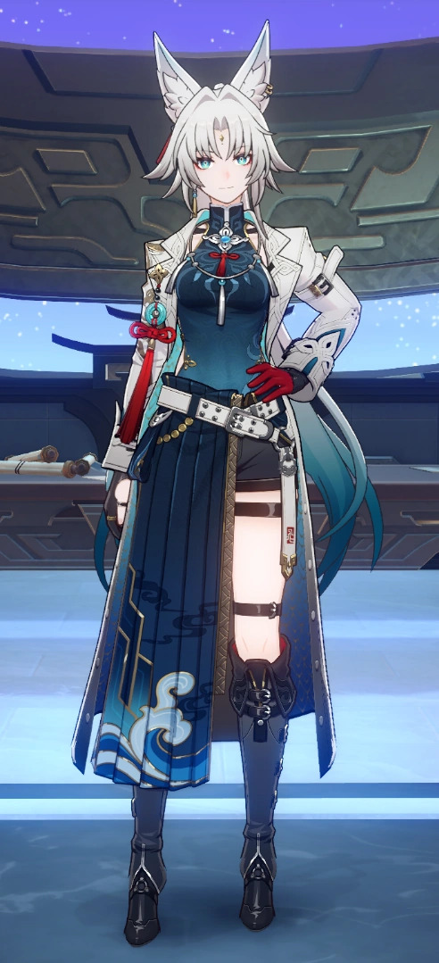 Вместе с этим её образ дополняли высокие чёрные сапоги на каблуках. Вкупе с уверенным и немного дерзким выражением лица, большими серыми ушками и длинными волосами, завязанные в один высокий хвост, это создавало поистине чудесную картину!