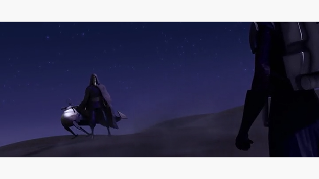 Скайоукер же сделал вид, что её не слышит. Обе звезды Татуина заходили за горизонт. Они шли уже что-то около четырёх часов. Энакин избрал чуть более короткий путь до Дворца Джаббы, считая, что Дуку решит атаковать того, кто «знает эту планету и идущего по более короткому пути более могущественного противника». И расчёт Энакина оправдался… Он поднялся на очередную дюну, когда перед ним появился спидер. Фигура, одетая в тёмные одежды… И эта аура могущества в Тёмной стороне. Энакин прекрасно понимал, кто перед ним. Ян Дуку собственной персоной. Энакин взял с пояса световой меч и активировал синее лезвие, когда Дарт Тиранус спешился со спидера.