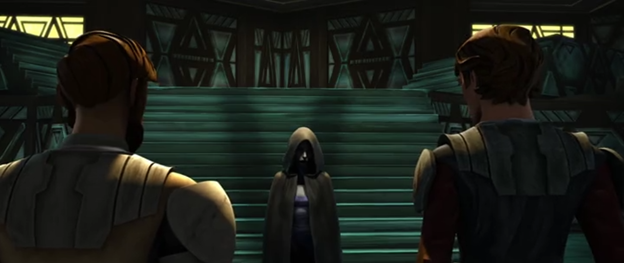 — Так вот оно — логово зверя, — окинул взглядом пустующую комнату Энакин. Лишь лестница вела на более высокий уровень. Вдруг оба Джедая ощутили присутствие тьмы. Тёмная фигура в капюшоне обошла обоих.
