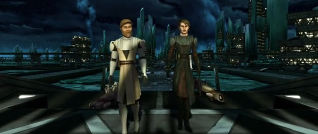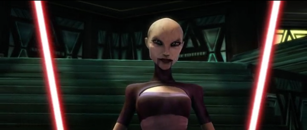 Девушка активировала оба алых клинка. Синие мечи Оби-Вана и Энакина вспыхнули в ответ.