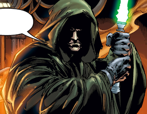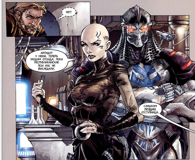 Справа от самого Дурджа стояла, держа пробирку с антидотом, Ассаж Вентресс. Битва при Ома-Д’уне, где она впервые вроде как засветилась не произошла. Мы явились сюда раньше, благодаря сведениям Фетта. И это первое столкновение Республиканцев и Джедаев с Вентресс. Она была одета в тёмное, облегающее верхнюю часть тела платье. Кожа, как и в каноне — белая, а голова лысая.