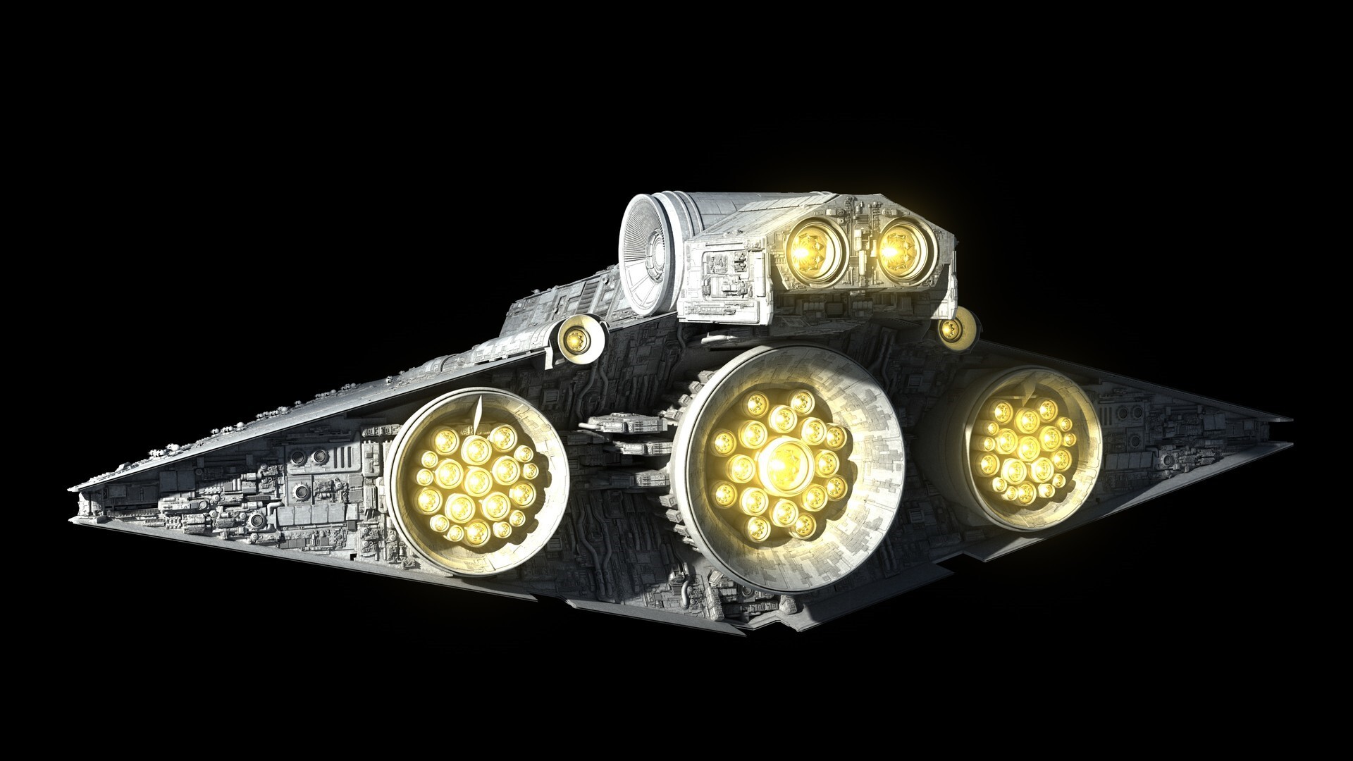 Помимо МЛА — в ангаре помещалось тридцать LAAT, причём из них десять из них были модификацией для доставки АТ-ТЕ. В плане техники в ангаре находилось семьдесят шагоходов, из которых двадцать класса АТ-ТЕ, ещё тридцать АТ-RT и двадцать АТ-ОТ. В атмосферу этот корабль заходить не мог, поэтому у него отсутствовали Джаггернауты и артеллерийские установки, так как они, в основном, высаживались при приземлении того же Аккламатора. Ангар располагался снизу, в подбрюшье. Но особое преимущество моего будущего флагмана — в орудиях. Главным калибром считались шестьдесят четырёхорудийных башен турболазеров… Это двести сорок орудий. В довесок шло — сорок двухорудийных башен — восемьдесят орудий мощности поменьше, десять двухорудийных, ионных башен, получается восемьдесят ионок для сноса щитов, пятнадцать двухорудийных башен зениток, то есть — тридцать орудий для зенитного прикрытия важных узлов корабля, особенно двигателей, рядом с которыми в нижней и верхней полусфере стояло аж по пять таких башен. И десять проекторов притягивающих лучей.