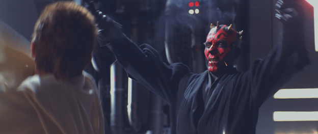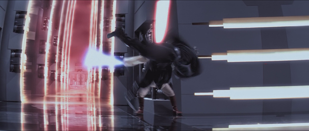 Но тот перепрыгнул атаку. Кеноби всё наседал и оказался спиной к шахте охлаждения, чем и вопользовался враг, нанеся телекинетический удар, отбросив падавана прямиком в шахту… На мгновение, Джинну показалось, что это всё. Он ничем не сможет помочь своему падавану. Даже его попытки наладить связь «Учитель-Ученик» — потерпели поражение. Кеноби был слишком поглащён схваткой и не смог открыть разум. Забрак подошёл к краю шахты и сбросил меч Оби-Вана вниз… Надежда угасла… Однако… Наконец, Квай-Гон смог достучаться до разума Оби-Вана и всё, на что был способен обездвиженный мастер — это указать Оби-Вану на световой меч Квай-Гона… Искры осыпались от ударов тёмного воина прямо на падавана. Ситх предвкушал победу над джедаями и вероятно — похвальбу от своего учителя. Однако он совсем забыл, что световых меча — два в этой комнате. Оби-Ван сосредоточил всю возможную Силу у своих конечностей и, перепрыгнув Ситха, параллельно притянув световой меч наставника, рубанул по его поясу.
