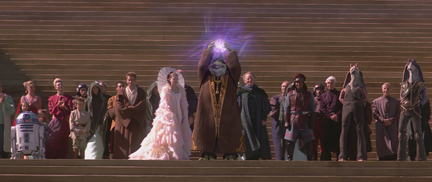 — МИИИР! — провозгласил Босс Ругор Насс, подняв шарик над головой. Ему его вручила Амидала.