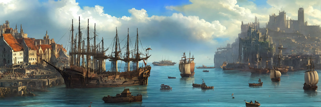 У морского порта было множество пришвартовано кораблей самых разных торговцев. У южной же части существовал третий порт — Замковый. Там было больше всего кораблей… Причём больших и вооружённых, с разными знамёнами на грот-мачтах, как окрестили моряки самые высокие мачты.