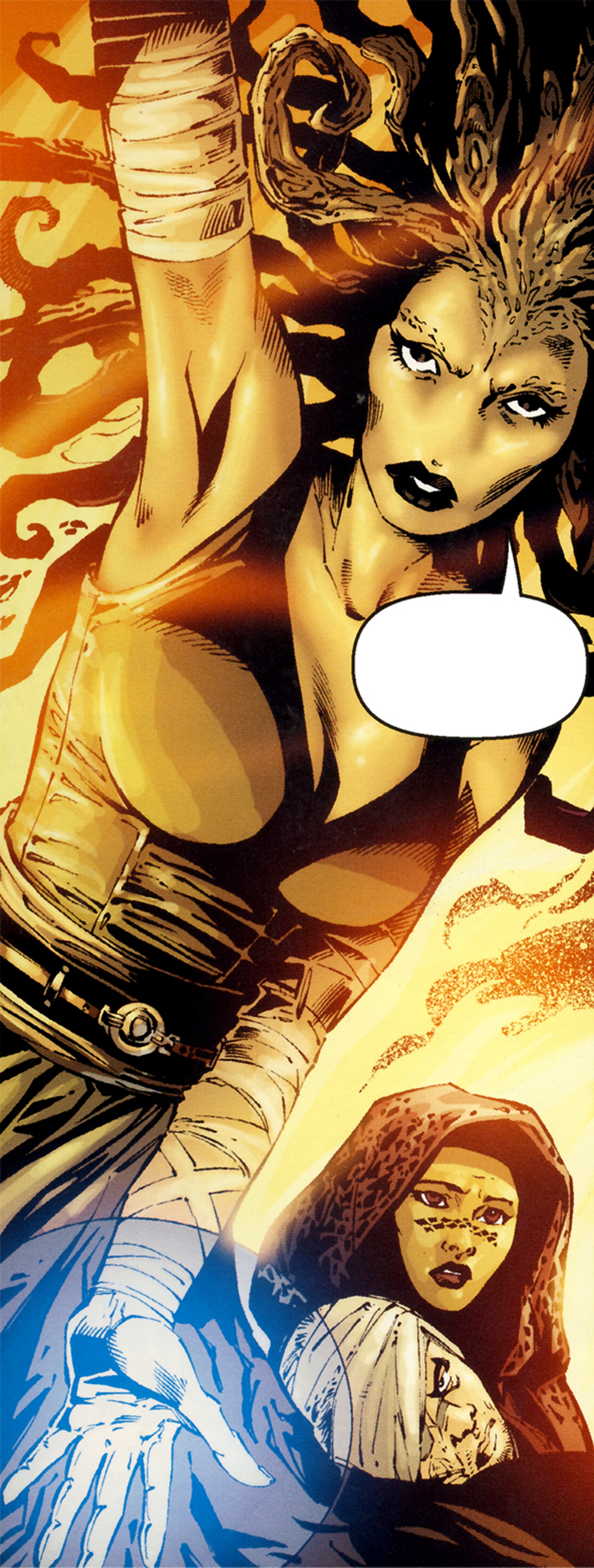 У неё было старое, иссохшее лицо и тёмные глаза с неприятным взглядом. Одета она была в стандартное одеяние своей культуры.