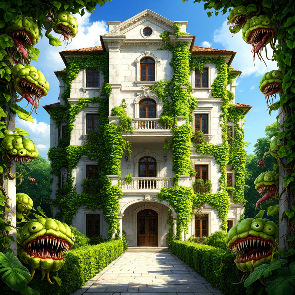 Жил я в роскоши, ни в чём себе не отказывая — на её территории был вырыт бассейн, вместо забора тут были колючие кустарники, плотоядно смотрящие на редких, мелькающих рядом послушников, внутри — зелёный газон, на котором было приятно поваляться. Сама вилла представляла собой трёхэтажное здание, выполненное из белого магического мрамора. Причём здание снаружи было не белым, а с зелёными вкраплениями, ибо по всей поверхности расползлось растение 1 ранга, защищающее мою обитель с одной стороны от магических и физических атак, с другой стороны — останавливая любопытные взгляды.