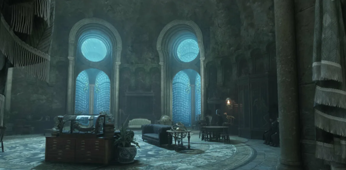 Почему именно эти темы? Дело в расположении гостиной Слизерина — она примыкает к Черному озеру, и большие окна позволяют разглядывать его дно. Стекло отделяет от водного массива, расположенного в шаговой доступности до Запретного леса.