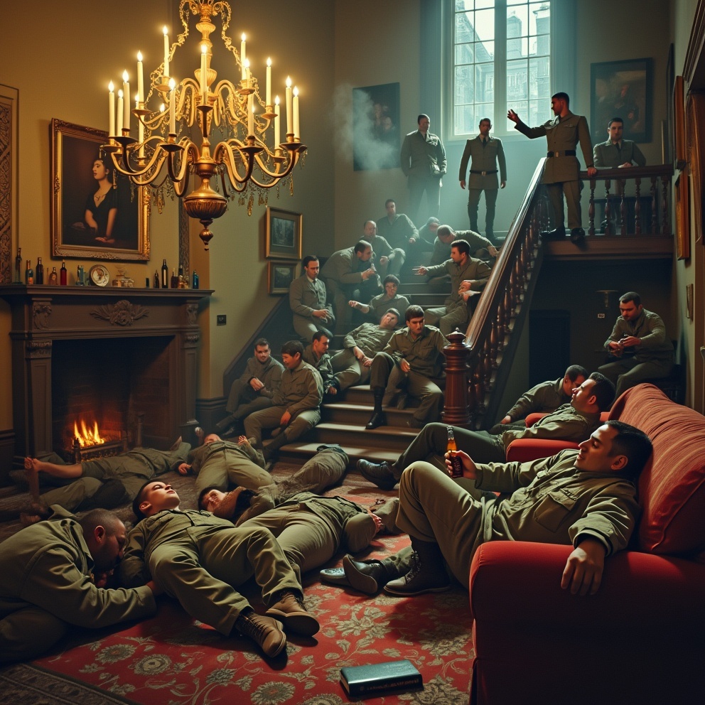 С разных концов дома начали доноситься приглушённые стоны, вздохи и ругань. Те, кто всё ещё спал, начали подниматься с пола, диванов и даже из самых нелепых укрытий. Один из бойцов, Роберт Вульф, приподнялся, обнимая декоративное растение, и пробормотал: