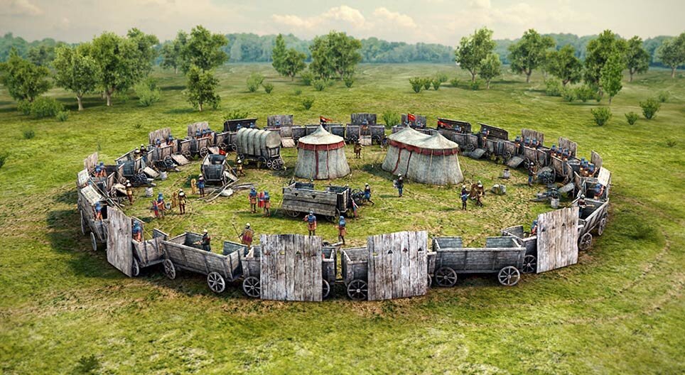 Для лучшего устроительства лагеря мы строили вагенбург. Это особая форма построения лагеря, в котором повозки выстраивались по периметру лагеря, как бы окружая его, охватывая палатки со всех сторон света и тем самым формируя импровизированные стены из повозок. Если я правильно помню, впервые такая структура была предложена ещё при династии Минг одним из тамошних полководцев, который отразил с помощью такого лагеря нападения кавалерии варваров, которые обитали в Царстве Минг на севере. После чего-то Царство активно использовало такую структуру построения временных лагерей и её постепенно переняли другие страны. Такую структуру куда как проще оборонять, кроме того — можно было точно расположить воинов так, чтобы самые подготовленные к обороне находились с краю лагеря и встретили врагов во всеоружии.