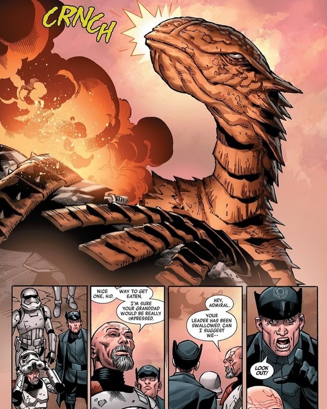 Хотя глупо сравнивать теперь уже реального монстра с эпичными боссами из игры. У реального монстра нет нескольких полосок ХП. Когда игрового босса иногда приходится бить часами, в реальности достаточно нанести пару фатальных ударов в уязвимые точки для победы. Для начала надо бы перетянуть внимание монстра на себя. Чудовище потихоньку сдавливает пойманный корабль, норовя расплющить пассажиров. Вдруг обшивку пронзило синие лезвие светового клинка. Похоже Энакин собирается разрубить корабль пополам, чтобы вылезти. Рискованная затея, но других нет.