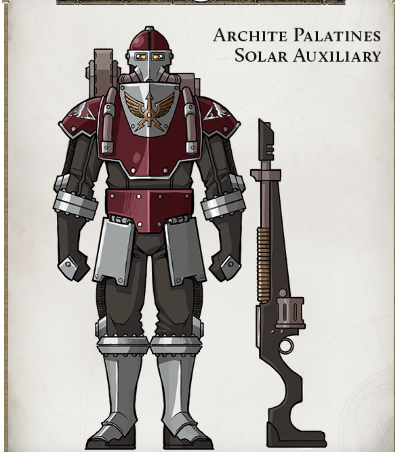 Что касается Имперской Армии — некоторые части Солярной Ауксильи, то есть грубо говоря — элитные части Имперской Армии и в самом деле воевали вместе с Легионами Астартес, и на официально картинке сверху, вы видите как выглядит боец Солярной Ауксильи который входил в состав войск что сопровождала Третий Легион.