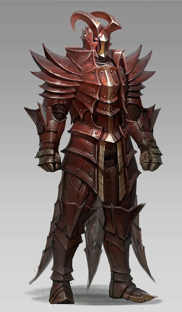Мирдин повернул голову, и его взгляд упал на фигуру, стоявшую в нескольких шагах. Это был человек, закованный в массивный доспех, тёмно-красный, с острыми шипами и изогнутыми пластинами. Шлем с рогами скрывал лицо, оставляя лишь узкую щель, через которую сверкали жёлтые глаза с вертикальными зрачками, холодные и нечеловеческие. Каждая деталь доспеха — от когтистых перчаток до заострённых наплечников — излучала угрозу.