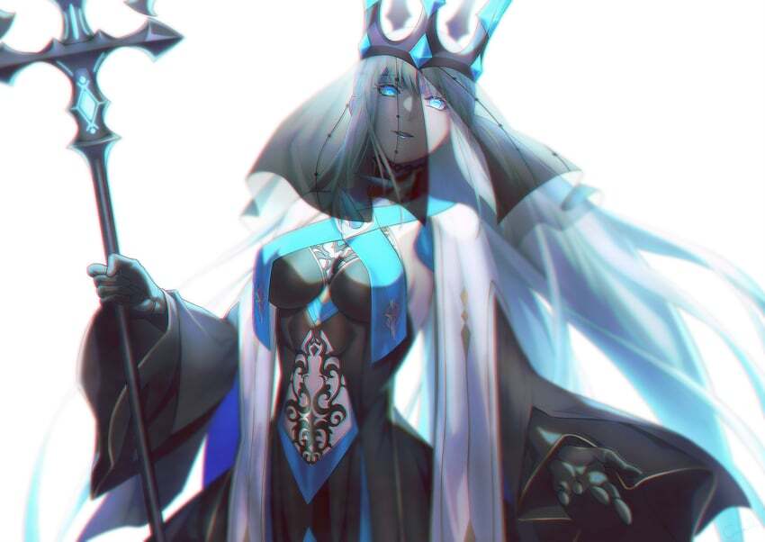 И стоило первым последствиям призыва осесть, как глаза каждого, кто мог нормально видеть после всего, обратились к единственному важному в этот момент месту. На пустующем ранее месте, посреди белых линий ритуального круга стояла стройная женщина. Её тело покрывало черное платье с несколькими синими вставками, на голове поверх белых, почти отдающих серебром волос, покоилась черная корона, а лицо закрывала полупрозрачная темная вуаль. В руках, возникшая из воздуха женщина, держала черный посох заканчивающимся длинным лезвием, её оружие до боли напоминало копье-посох, которое Радагону подарила Скатах, отличаясь лишь в цвете.
