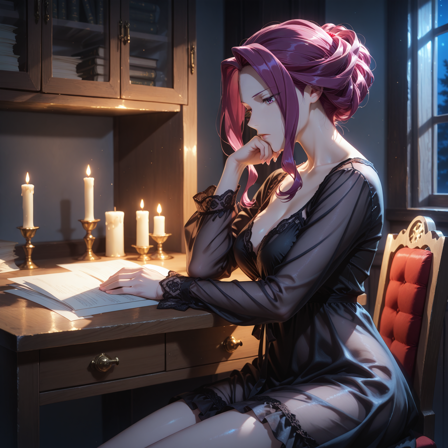 Дверь без какого-либо сопротивления открылась от лёгкого толчка. Войдя внутрь, я увидел больше рабочий кабинет, чем личную комнату женщины. Да и сама Мирелия в моё поле зрения попала не сразу. Спальной частью была, скорее, правая сторона комнаты, где и стояла кровать. А вот повернув голову в левую сторону, я уже смог обнаружить королеву, погружённую в изучение и подписание каких-то бумаг. Которых за столом, где она и сидела, была целая гора.