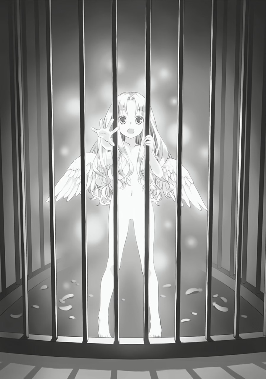 — …ин… — раздался тихий голос, как только мы обернулись к происходящему. — Господин! — и увидели в клетке не здоровенную пухлую птицу, а маленькую девочку со светлыми волосами. Совершенно голую, к слову. — Господин! Пожалуйста… не бросайте меня! — она потянула руки в сторону Наофуми. — Смотрите, я тоже могу так выглядеть! Как сестрёнка Найт!