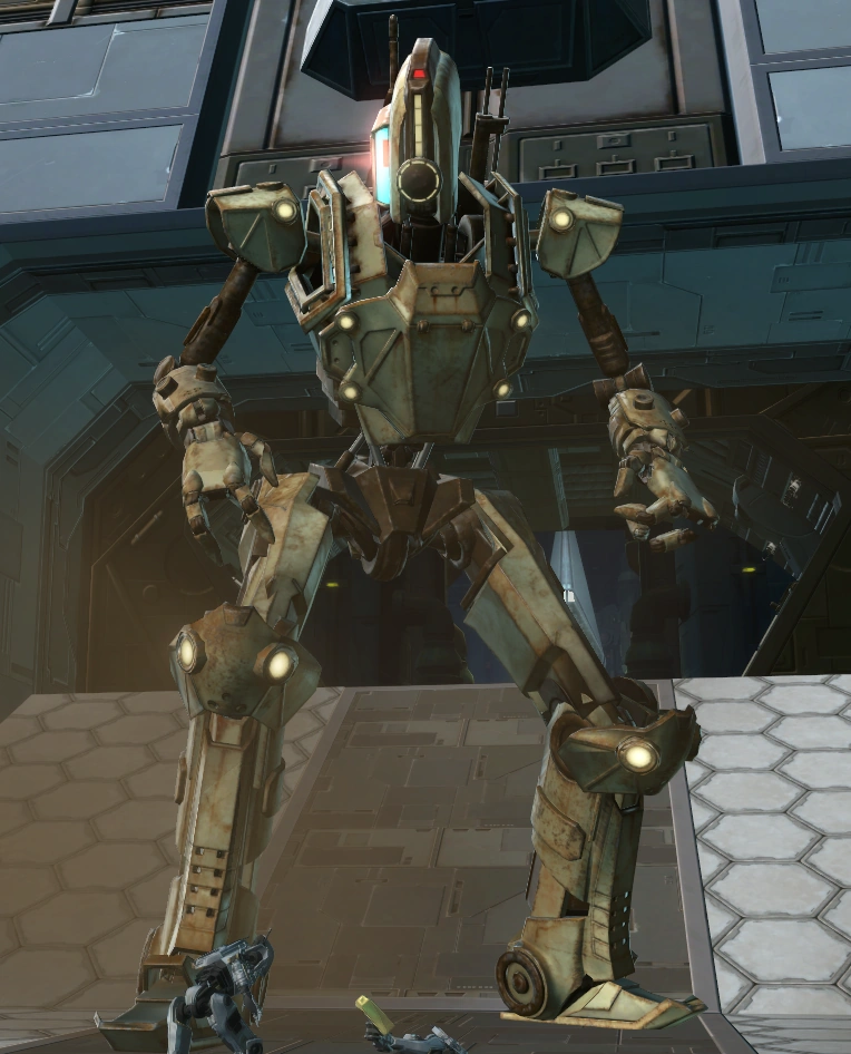 Несколько сощурившись и направив в глаза Силу, я быстро увидел стрелявшего, бывшего немалых размеров по местным меркам. Вдвойне занимательно, что он был весьма технологичным дроидом.